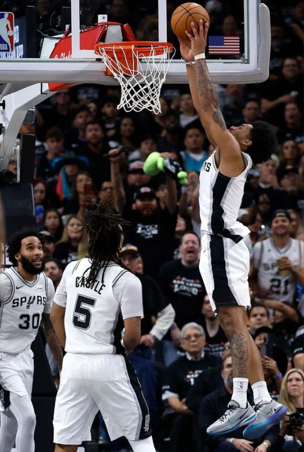 易边再战,卡斯尔冲击克林根,被吹进攻犯规。阿夫迪亚扑防尚帕尼三分犯规 ,裁判回看后又追加一级恶犯,有垫脚嫌疑。亨德森反击极速飞, 腾空暴起双手炸扣虐筐,卡斯尔剩2秒传球 ,哈珀接锅压哨三分一箭穿心。格兰特底线强突上篮 文班补防结结实实钉板大帽,随后先背运过掉霍勒迪,面对罗威完成打板2+1,马刺再领先到23分。